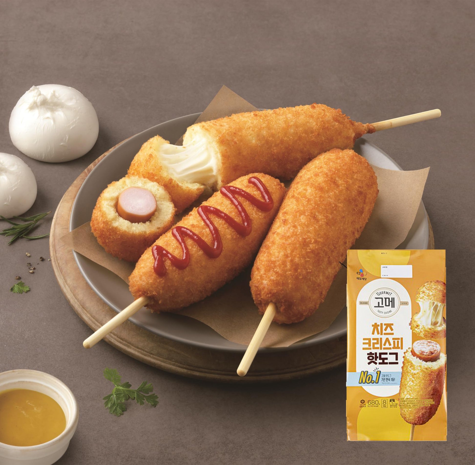 The Korean classic cheese filled corndog! It is filled with delicious mozzarella cheese where you can have fun stretching while eating. Best with Air fry to cook at home. 必品阁韩式芝士热狗